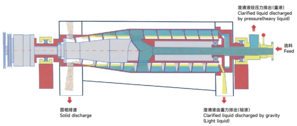 LWS series three phase decanter centrifuge is used for solid-liquid-liquid separation.namely one kind of solid phase ( with largest specific gravity) and two kind ofimmiscible liquid phase with different density The conveyor rotates in the samedirection as the bowl, but at a different speed, the material is fed into the bowlthrough a stationary feed pipe. Centrifugal forces cause instant sedimentation of thesolids on the wall of the bowl, while two liquid phases forming light liquid phaselayer and heavy liquid phase layer Scroll conveys the solids towards the conical endof the bowl, and out of centrifuge from solid discharge port. The light liquid phasethen is discharged out continuously through the overflow port at the large end ofthe bowl, and the heavy liquid phase will be discharged out through the centrifugalpump large end of the bowl, thus realizing the three-phase separation.
