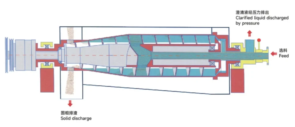This machine type is used for solid-liquid separation of materials. The bowl rotatesin the same direction as the spiral, but at a different speed. Material is fed into thebowl through the feed pipe. With the centrifugal force, the solid phase materialsdeposit on the bowl wall and form a sediment layer The liquid phase materialsforms a liquid phase ring and a solid phase layer and a liquid phase layer successive-ly from the bowl wall to the inward. The liquid phase then is discharged out throughthe bowl’ s centripetal pump at the large end.
