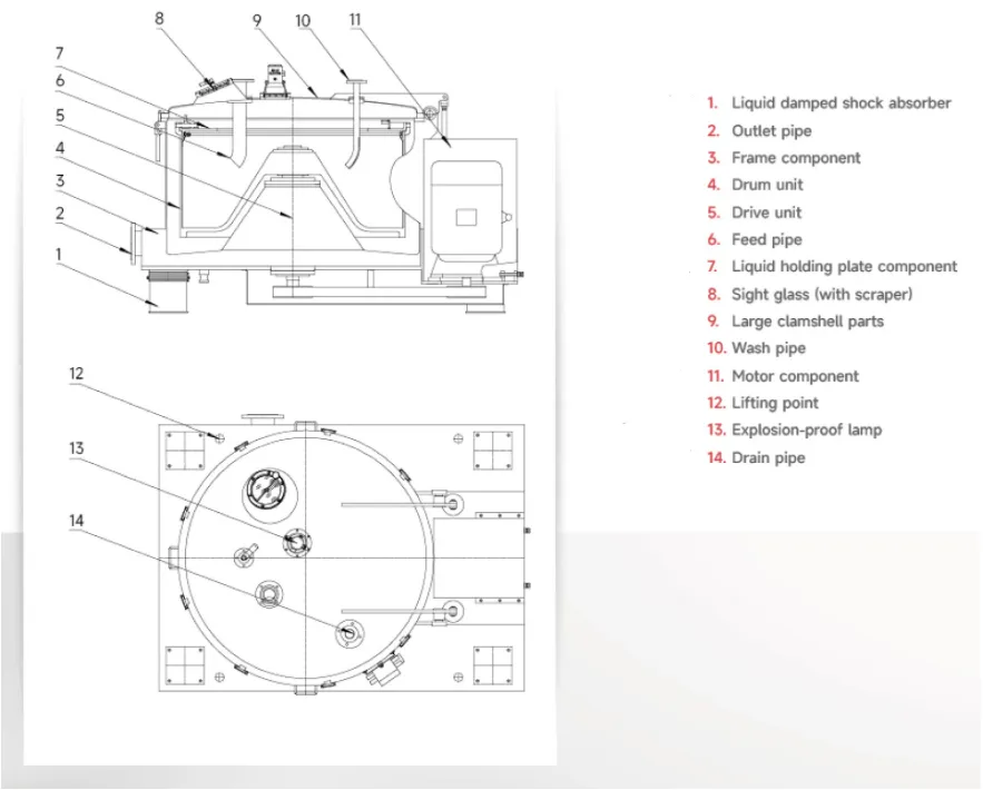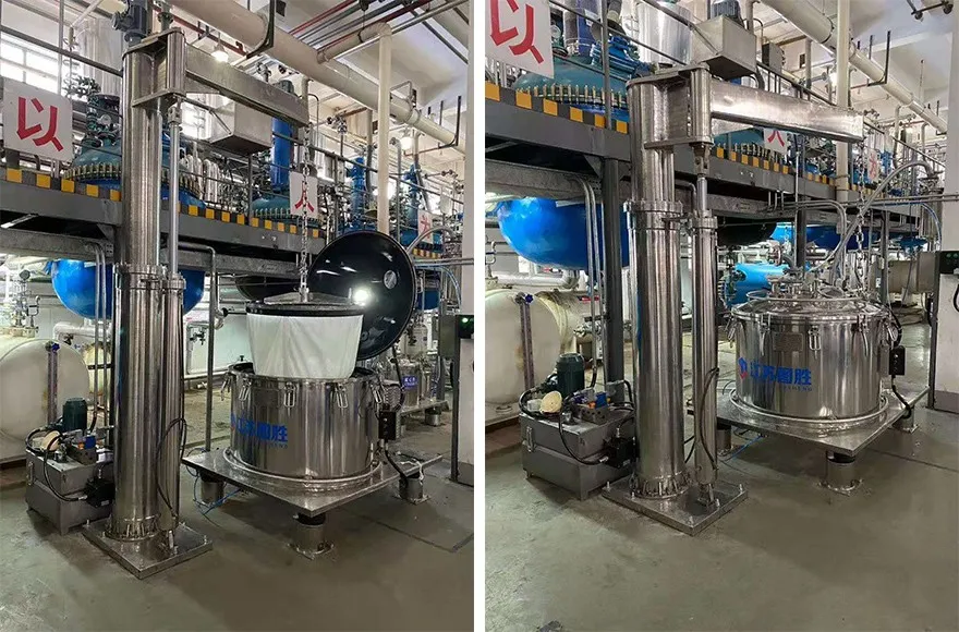 Once the materials to be separated enter the fast-spinning basket,it will be filtrated by the filter liner under the centrifugal force The liquid fluws out throuah the licuid outlet. but solids deposit on the internal wall of the basketOnce the solid cake reaches the rate capacity feeding stops Wash the solids cake and then drain out the washing water Finally ston the machine Use theliftingtool or crane to lift out the filter cloth with solid cake.andmove to the discharging place Open the filter cloth and discharge the solid cake Put the filter cloth back to the centrifuge and move to next batch.